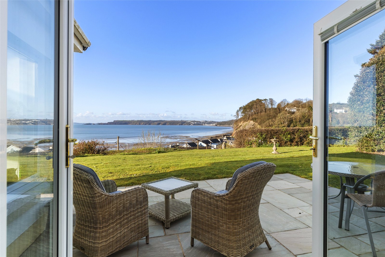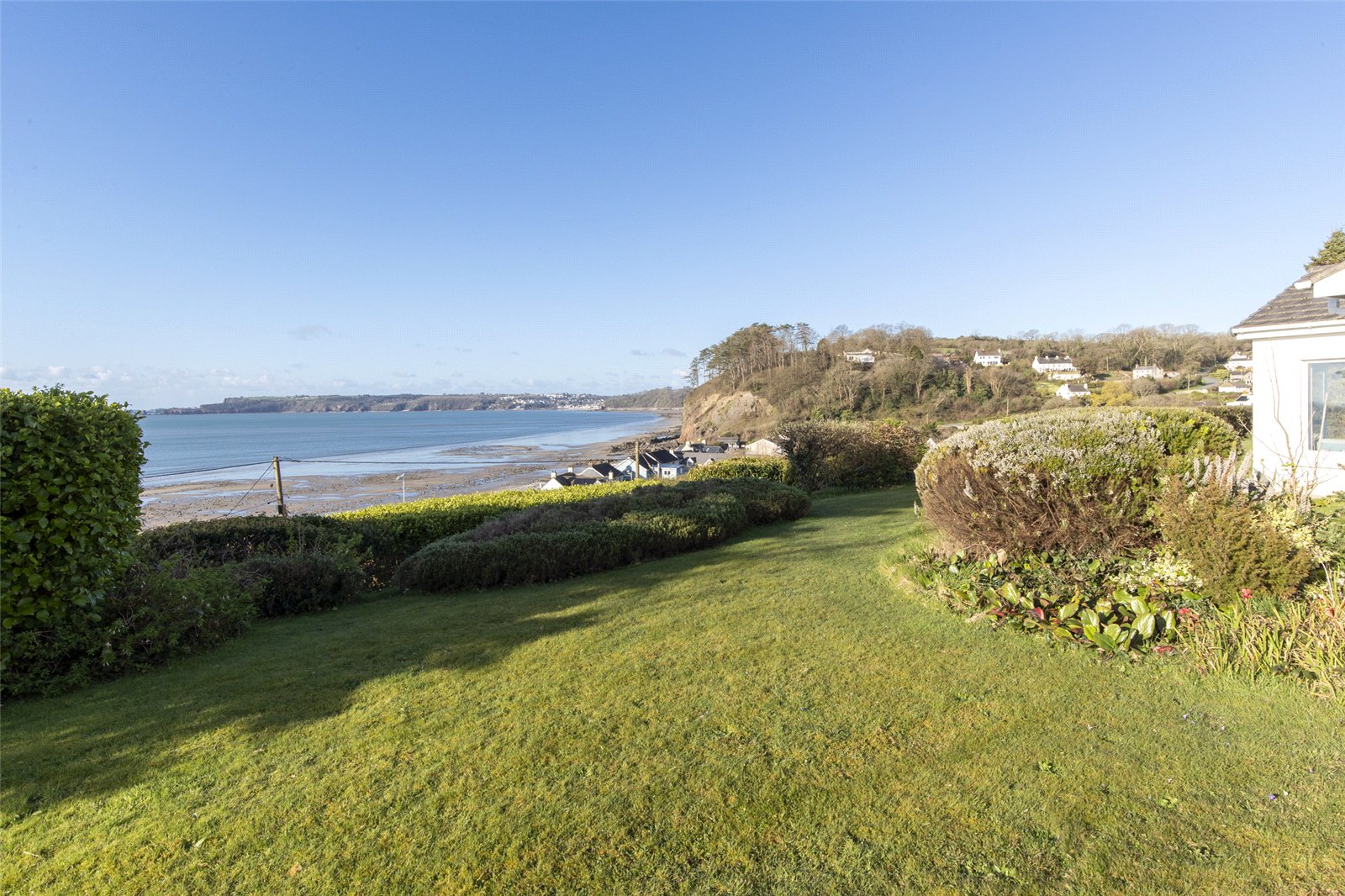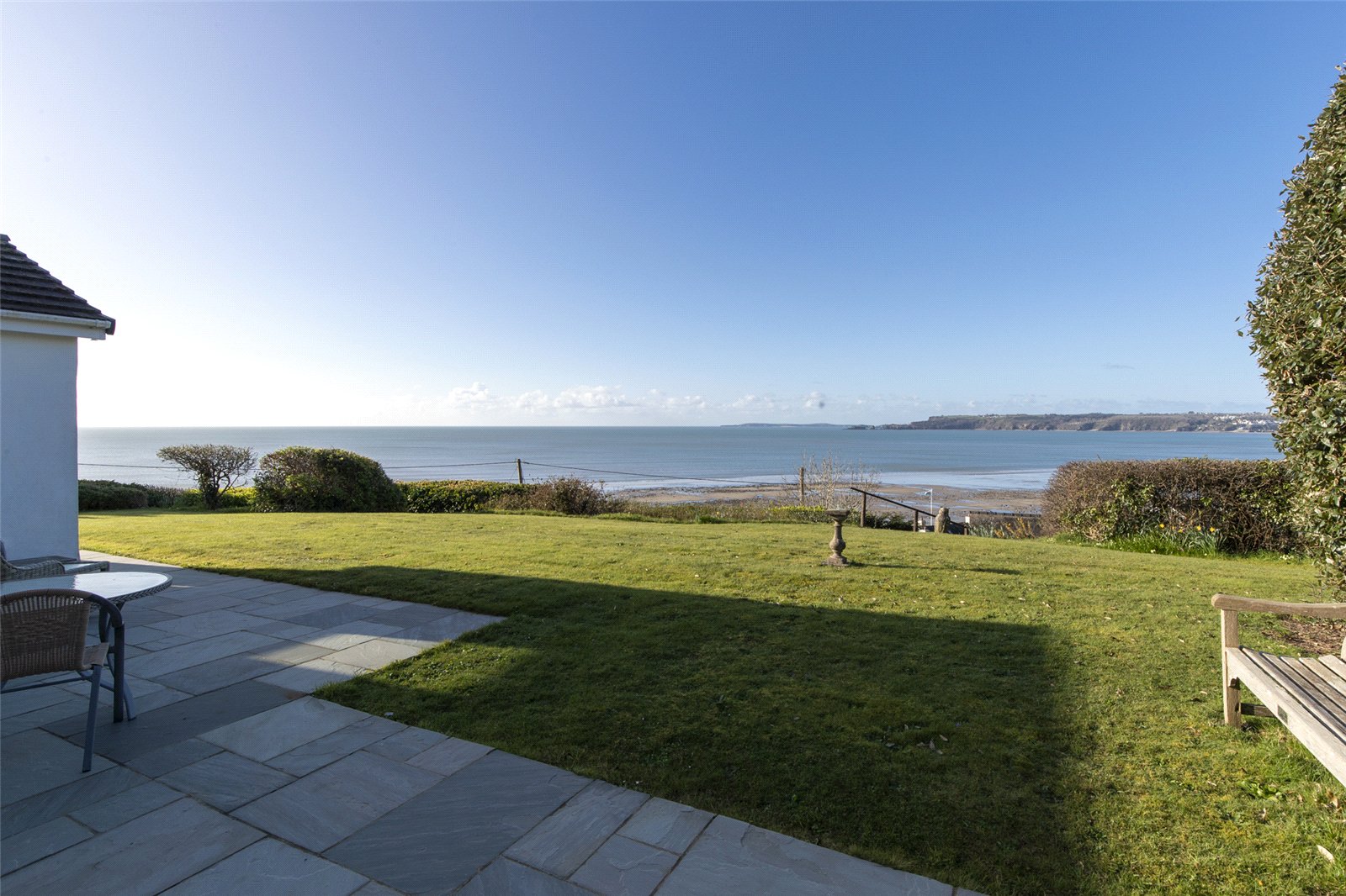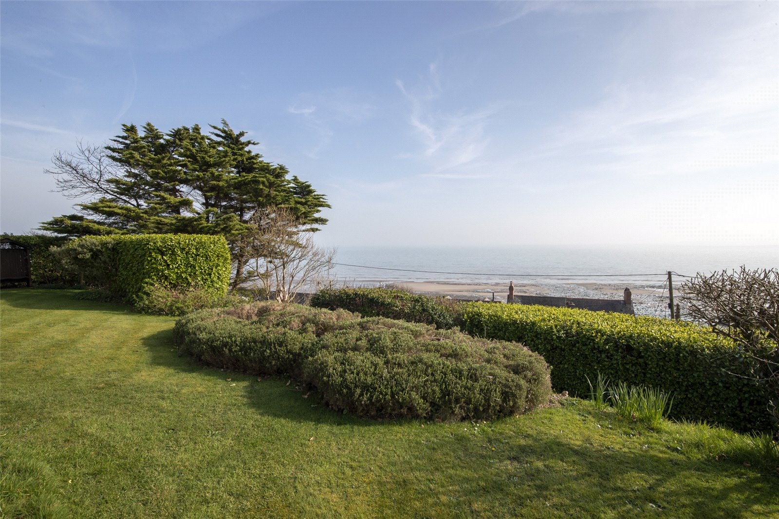 Set in an enviable coastal position, this beautifully maintained garden enjoys uninterrupted sea views and a wonderfully tranquil atmosphere. A generous expanse of level lawn provides an ideal space for outdoor entertaining, family use, or simply relaxing while taking in the stunning surroundings.