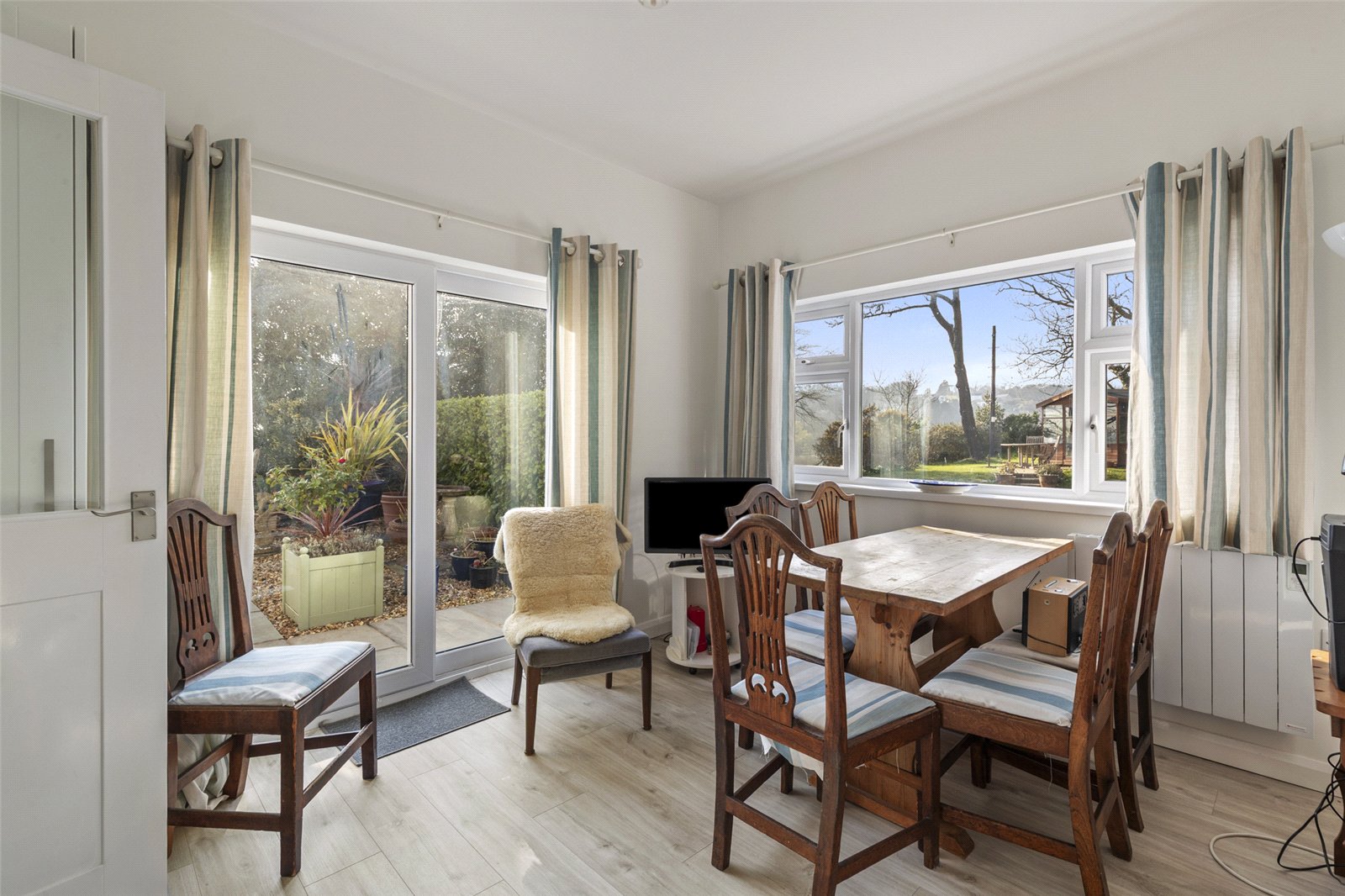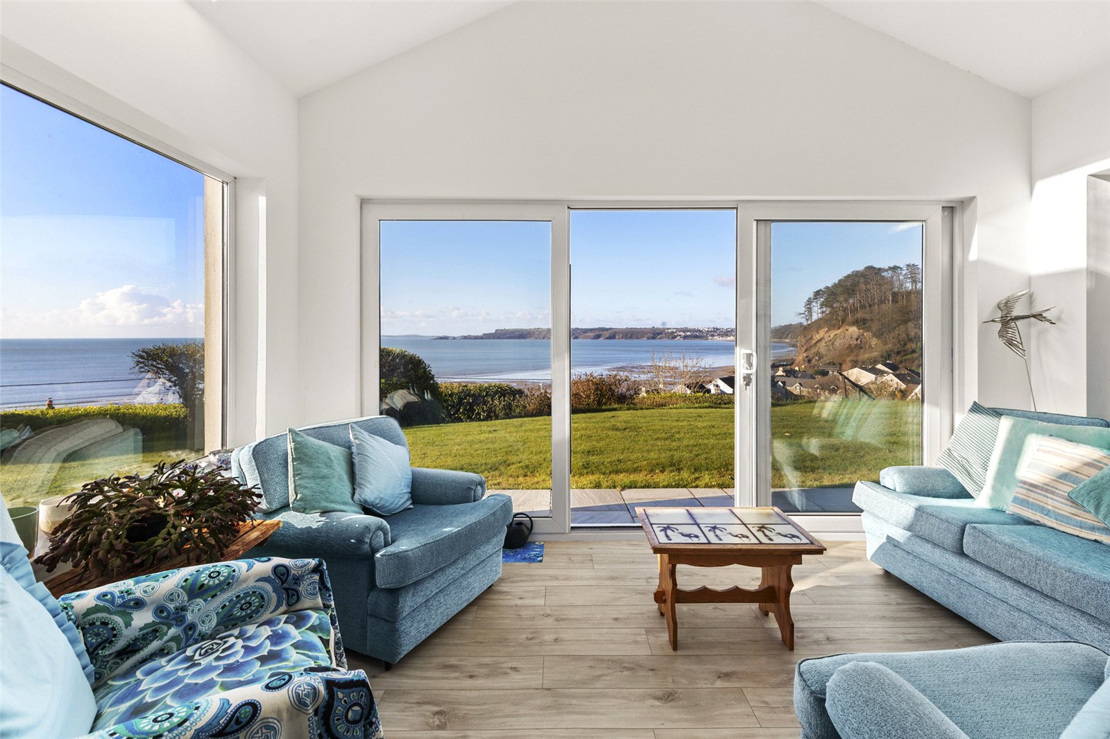 A bright and airy sunroom featuring laminate flooring, uPVC windows and patio doors, and Velux skylights. Equipped with an electric radiator, the space offers expansive, uninterrupted sea views.