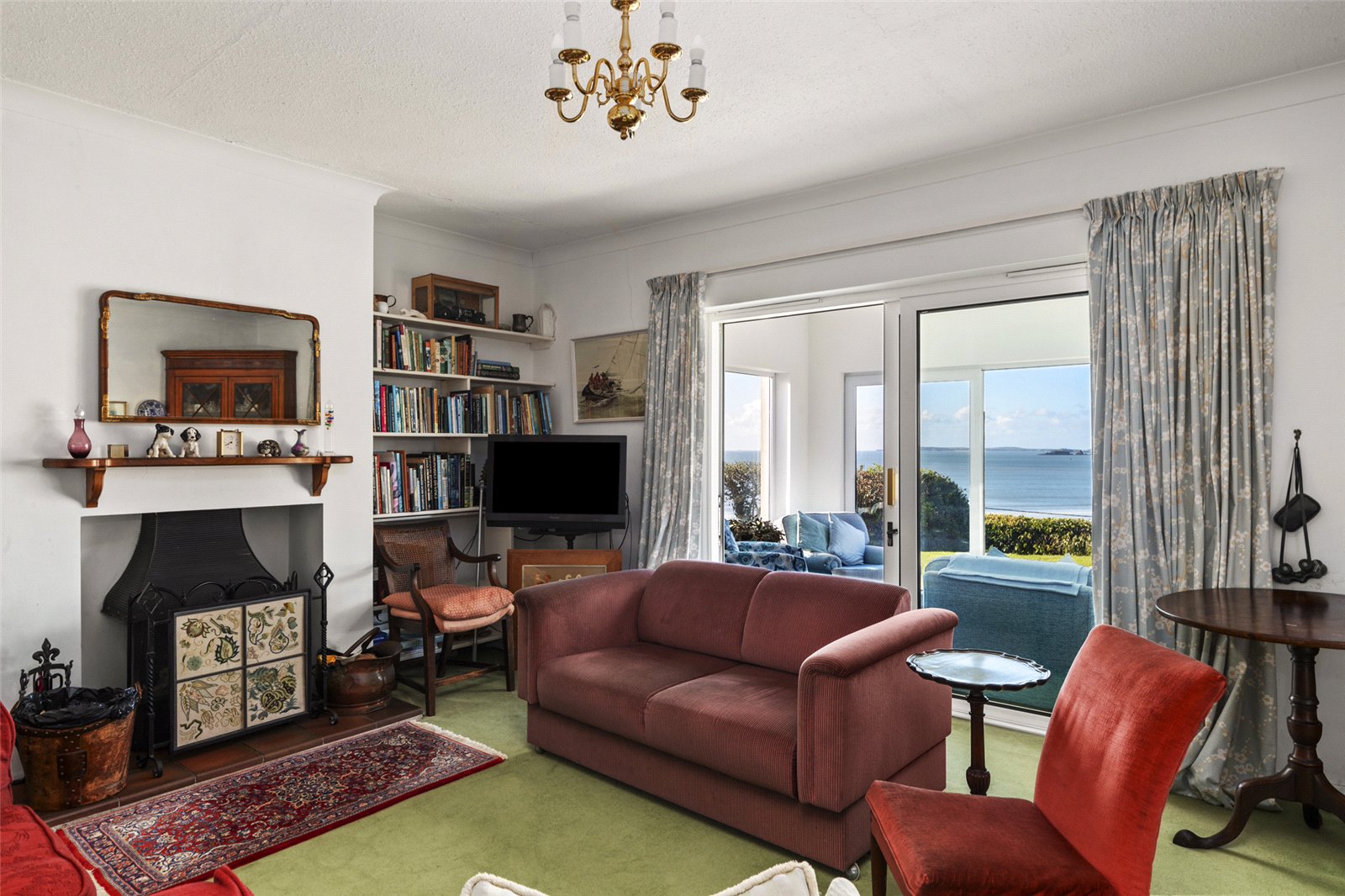 Carpeted living area with a feature open fireplace and radiator, opening through patio doors into the sunroom, which boasts panoramic sea views.