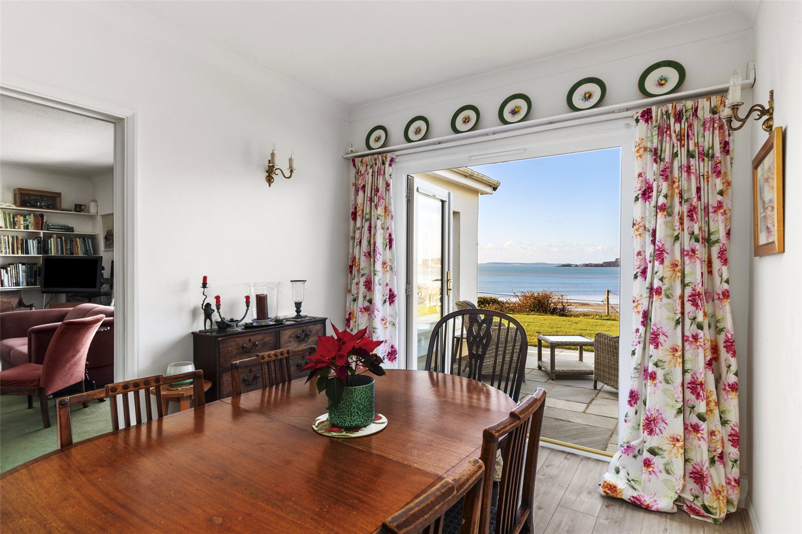 Featuring laminate flooring and an electric radiator, this room is complemented by a uPVC side window providing natural light. Patio doors open out onto the garden, enjoying attractive sea views, while an internal door leads through to the study.