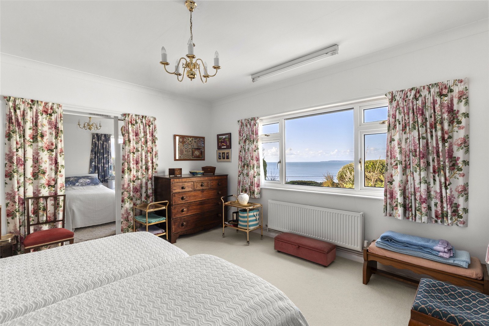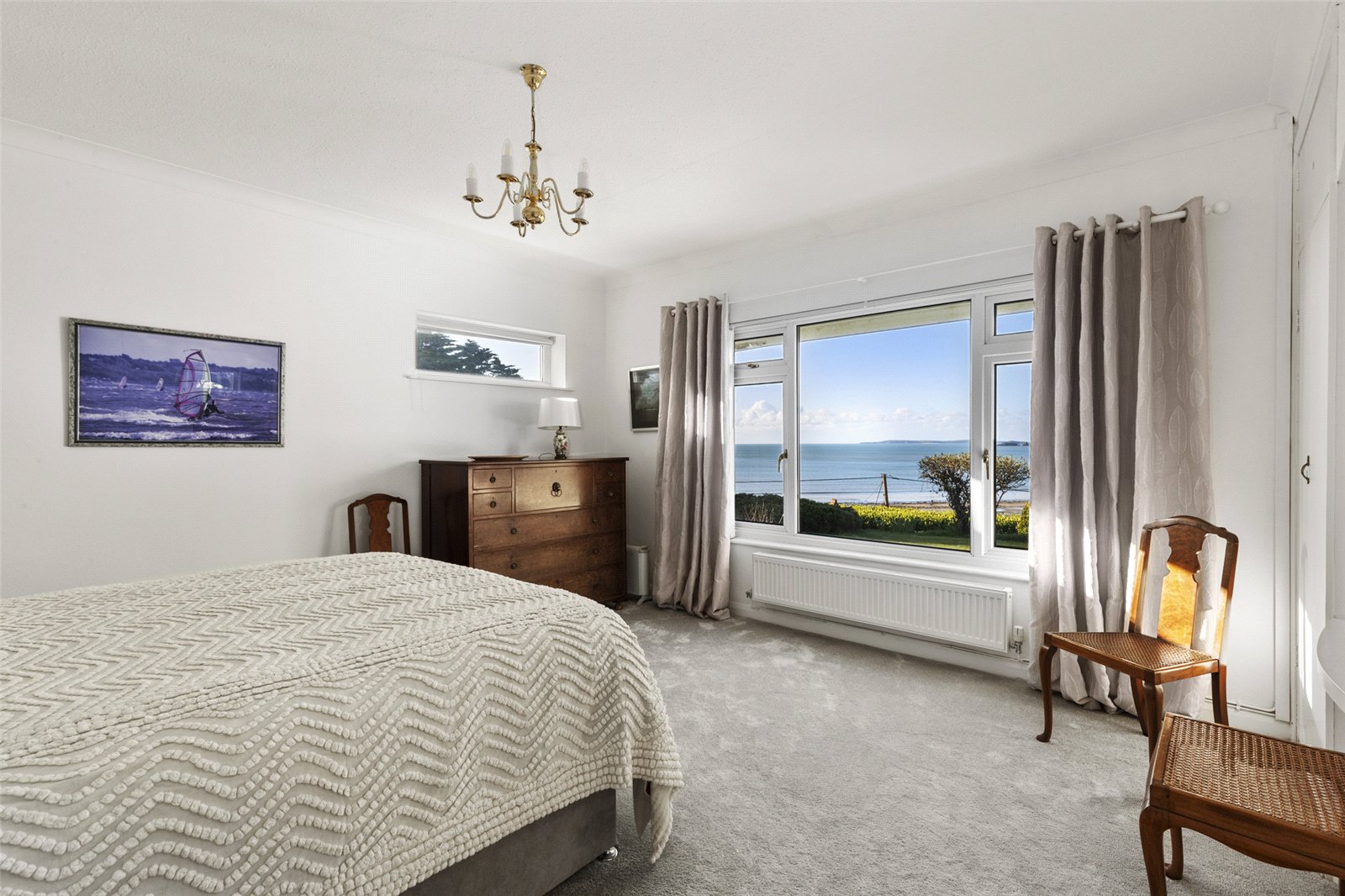 Carpeted bedroom featuring fitted wardrobes and a dressing table, a radiator, and a uPVC window with uninterrupted sea views.