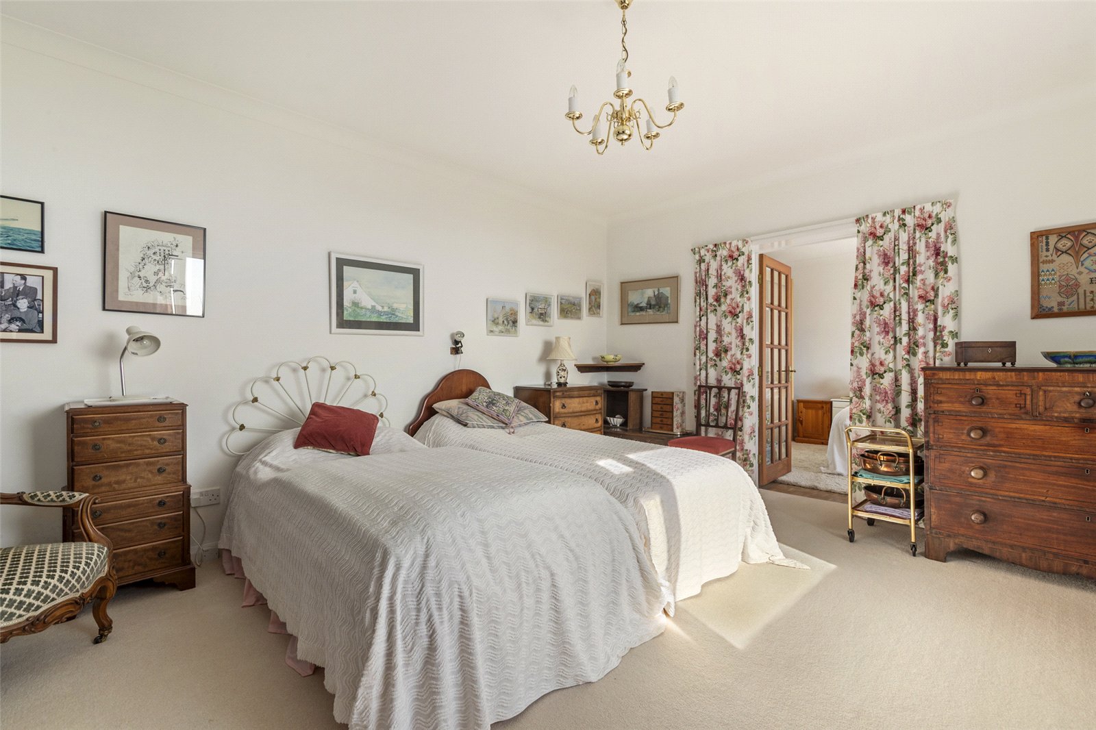 Carpeted dressing area leading into the master bedroom, featuring fitted wardrobes, a radiator, and a uPVC window.