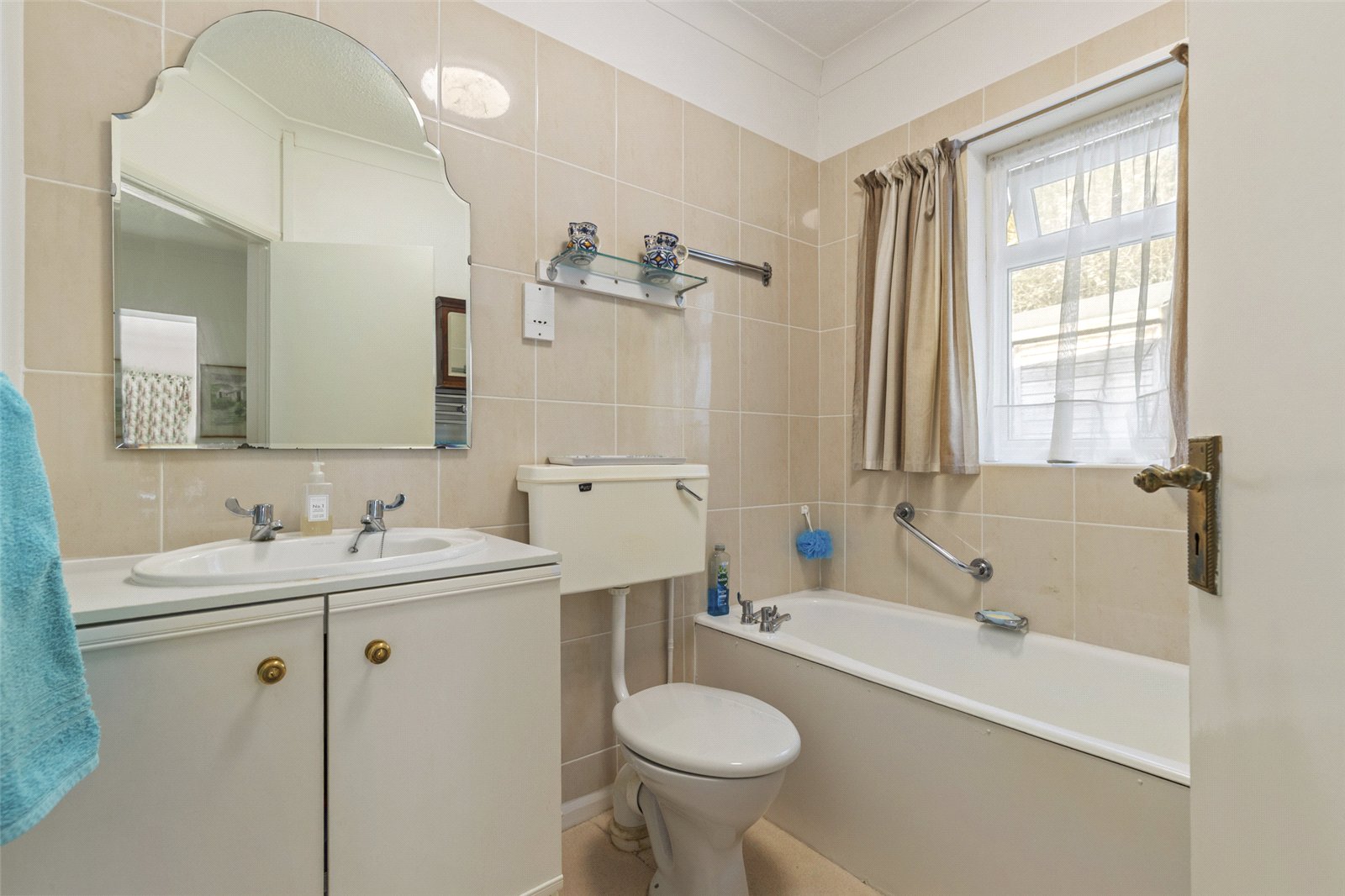 Partially tiled bathroom with a carpeted floor, WC, and wash hand basin set within a vanity unit. Finished with a towel rail and a uPVC window.