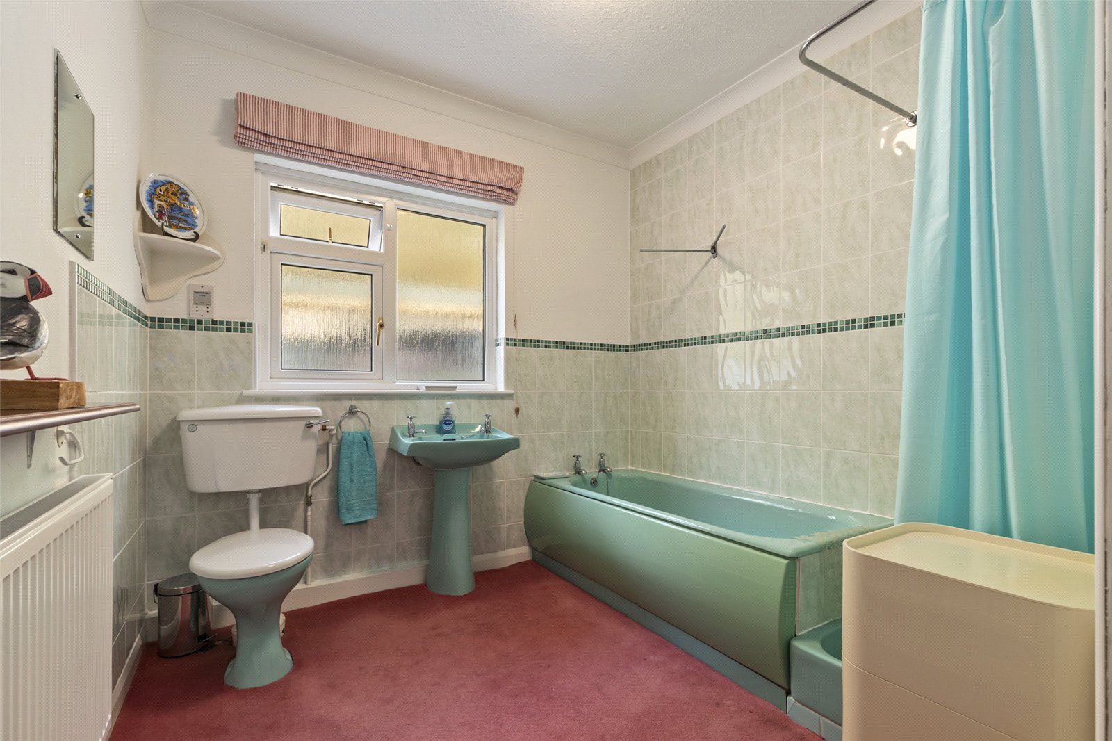 In need of some modernisation, this spacious main bathroom features a carpeted floor, uPVC window, WC, wash hand basin, bath, separate shower, and a radiator.