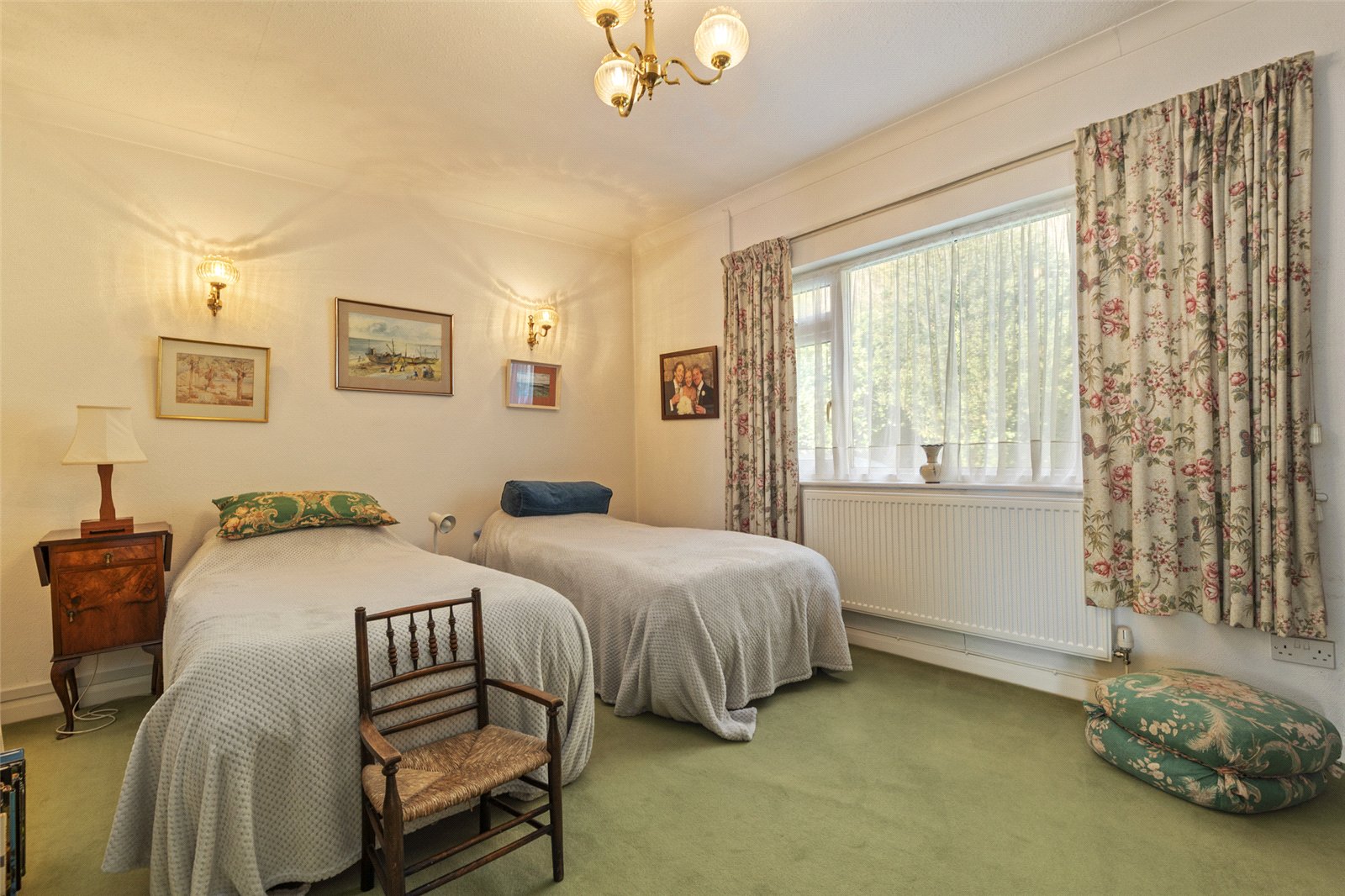 Carpeted bedroom with a storage cupboard, radiator, and a uPVC window.