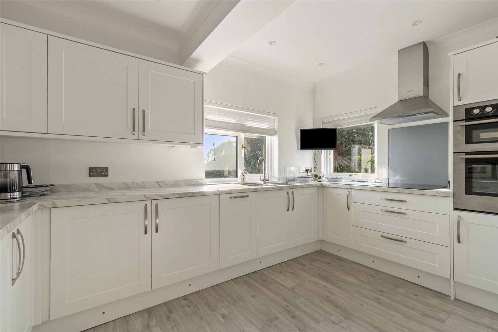 A well-appointed kitchen featuring a range of wall and base mounted units complemented by marble-effect worktops. Enhanced by under-cabinet and kickboard lighting, the space includes integrated appliances such as a fridge freezer, dishwasher, hob, and double ovens, along with an extractor fan. A double sink adds practicality, while two uPVC windows frame stunning panoramic sea views, flooding the room with natural light.