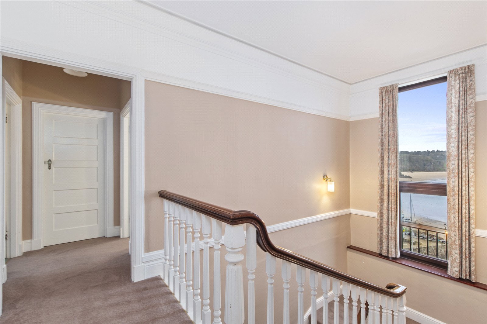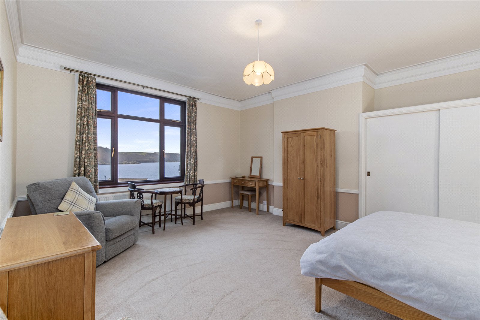 The large sitting room features an open gas fire and stunning harbour views with bespoke privacy glass panelling. The rear of the living room features a built in library.