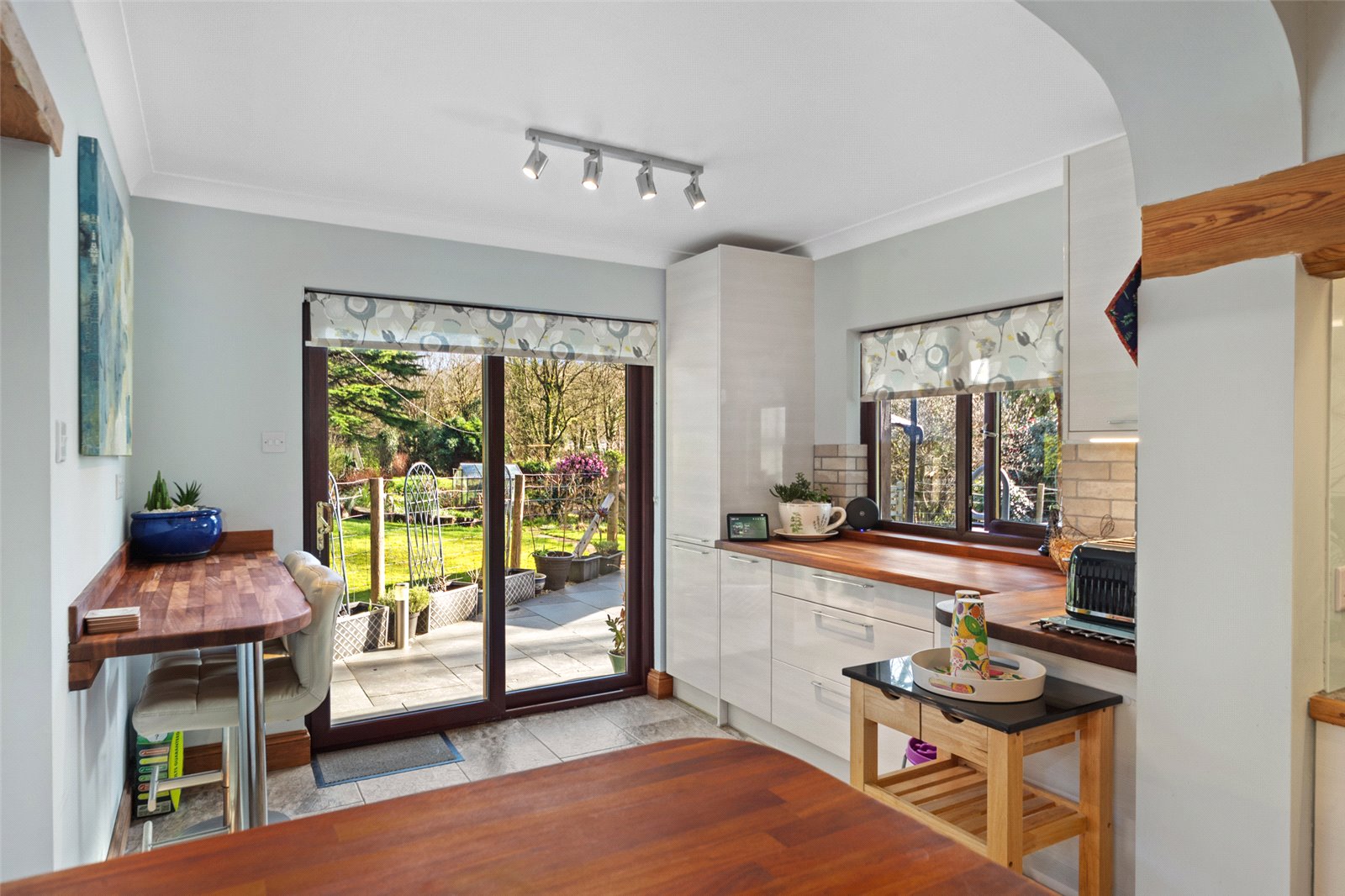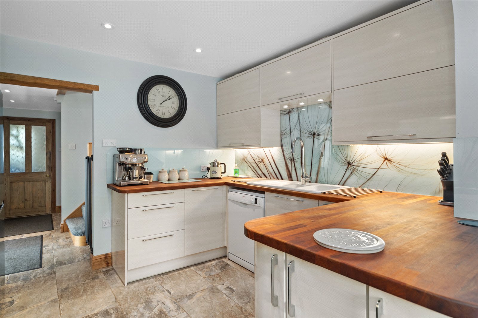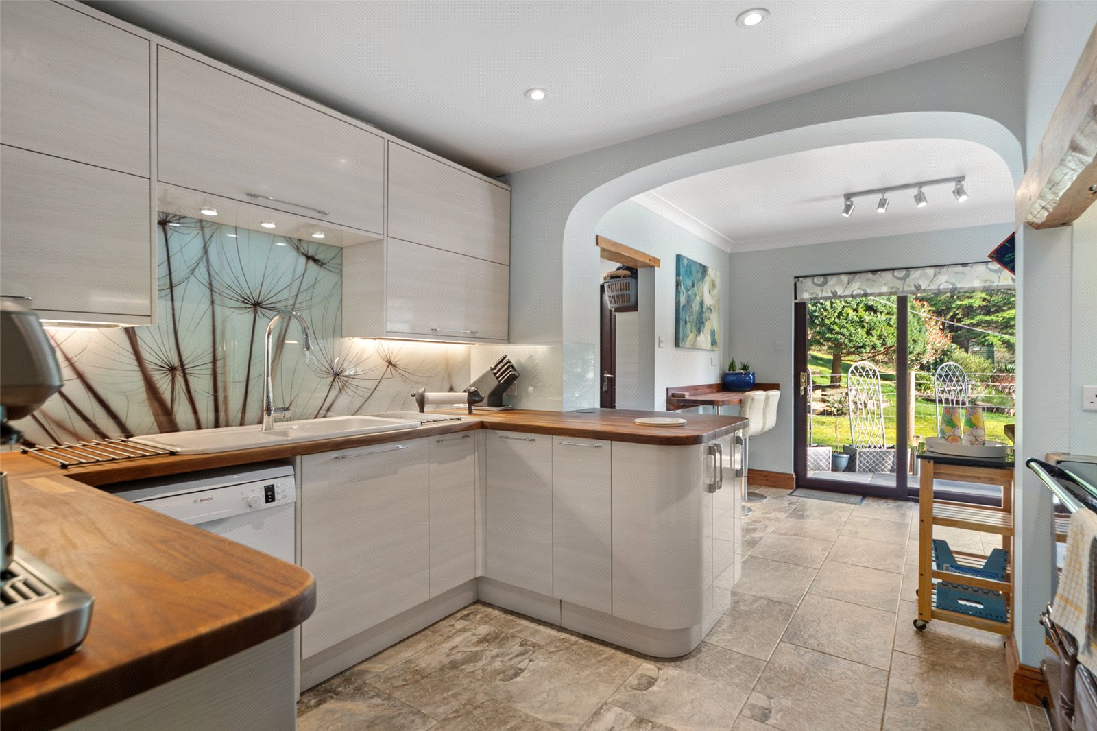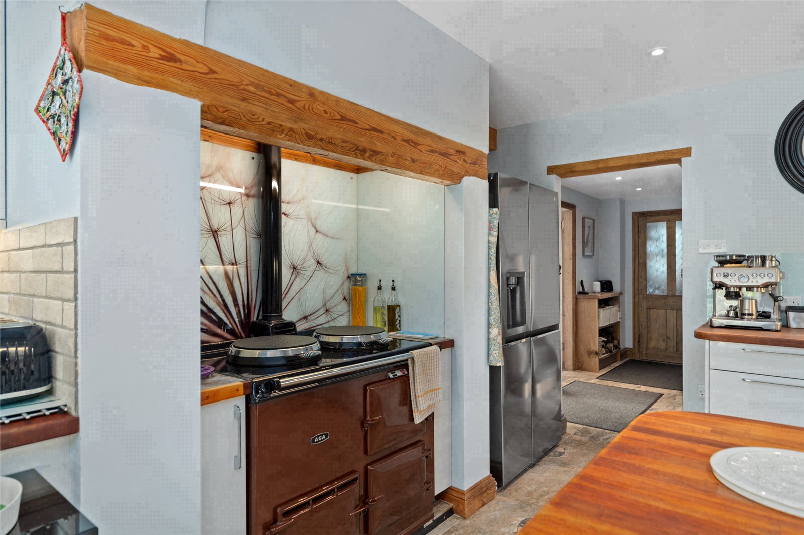 The kitchen is a chef's delight, featuring an alcove with a functional double oven Aga and a decorative glass splashback. Also comprising of modern wall and base units, with integrated ceramic 1.5 sink and space for white goods, and a breakfast bar give ample functional workspace. A uPVC double-glazed window with garden views ensures a level of natural light throughout and double patio doors leading to the delightful patio area... Access to;