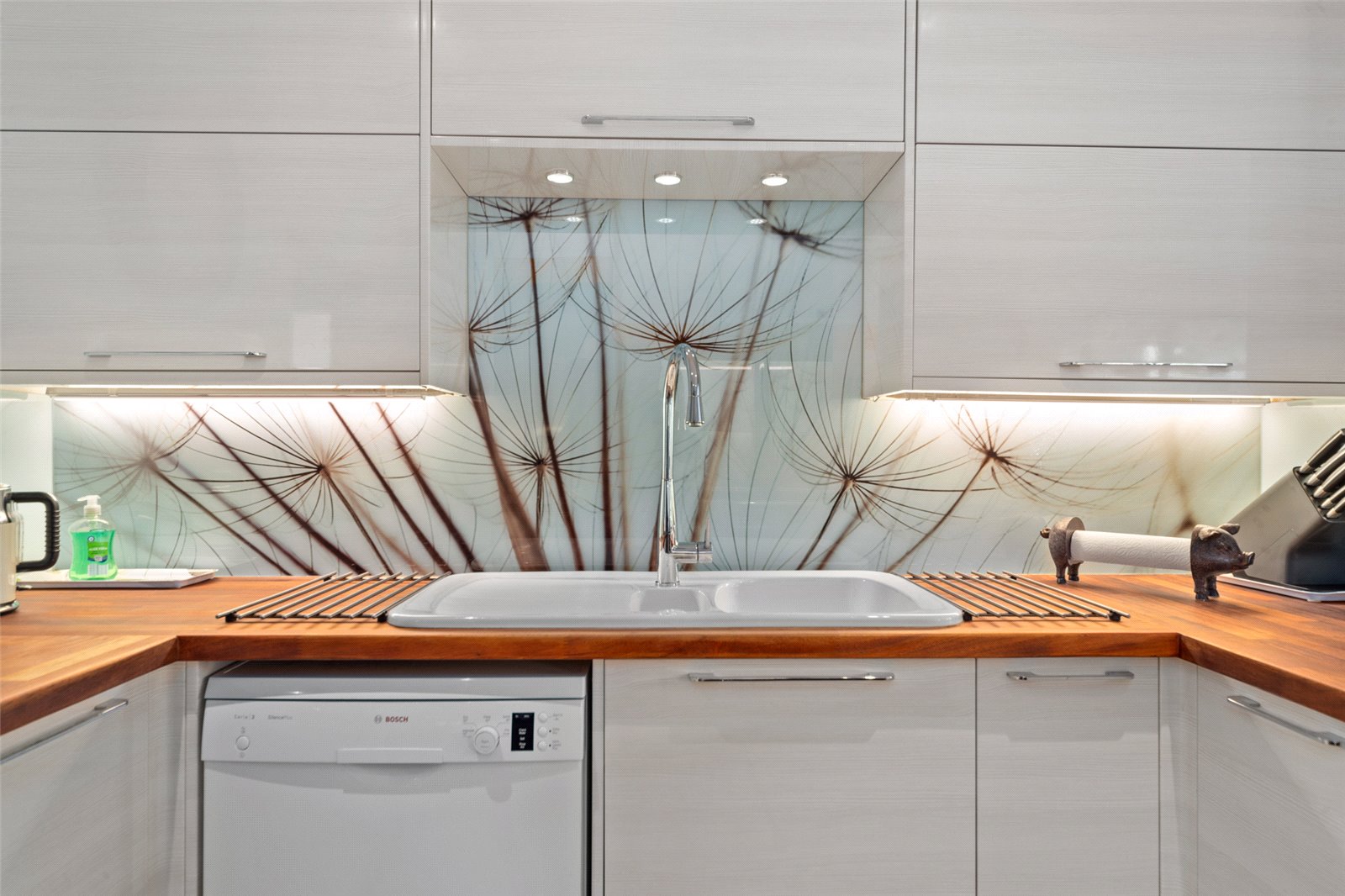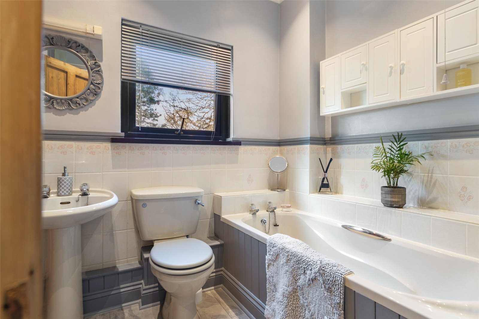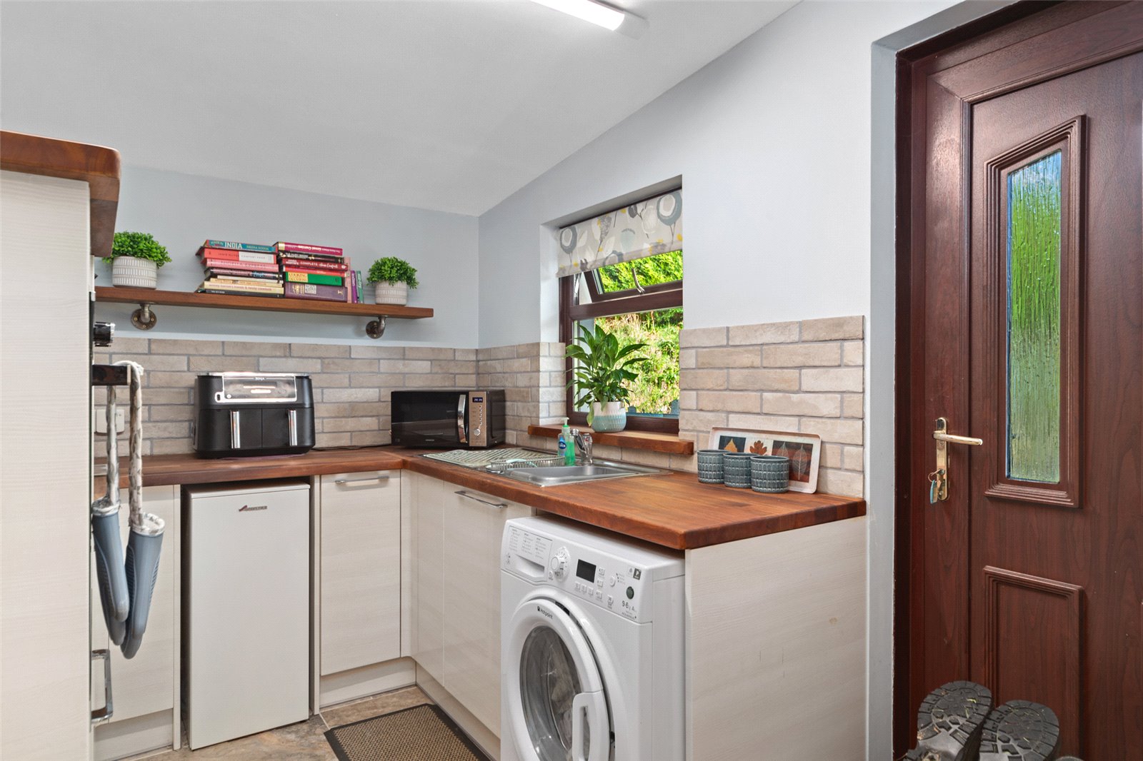 Efficiency meets aesthetics in the utility room, which could effectively function as kitchen space in its own right. The utility comes equipped with base units, iroko worktops, and integrated appliances; including Beko electric fan oven & grill, four-point halogen hob with extraction hood and lighting above and a 1.5 sink & drainer. The uPVC door gives access to the garden, and the double-glazed window provides a pleasant view. The property’s Worcester oil boiler is conveniently placed within the base units.