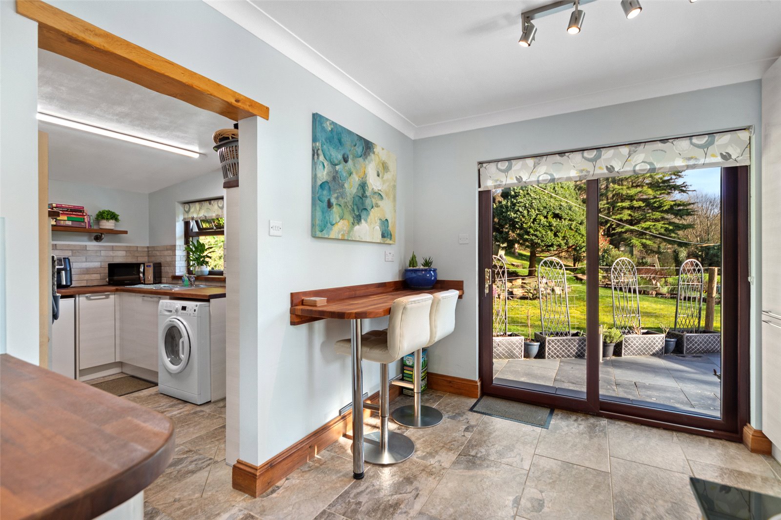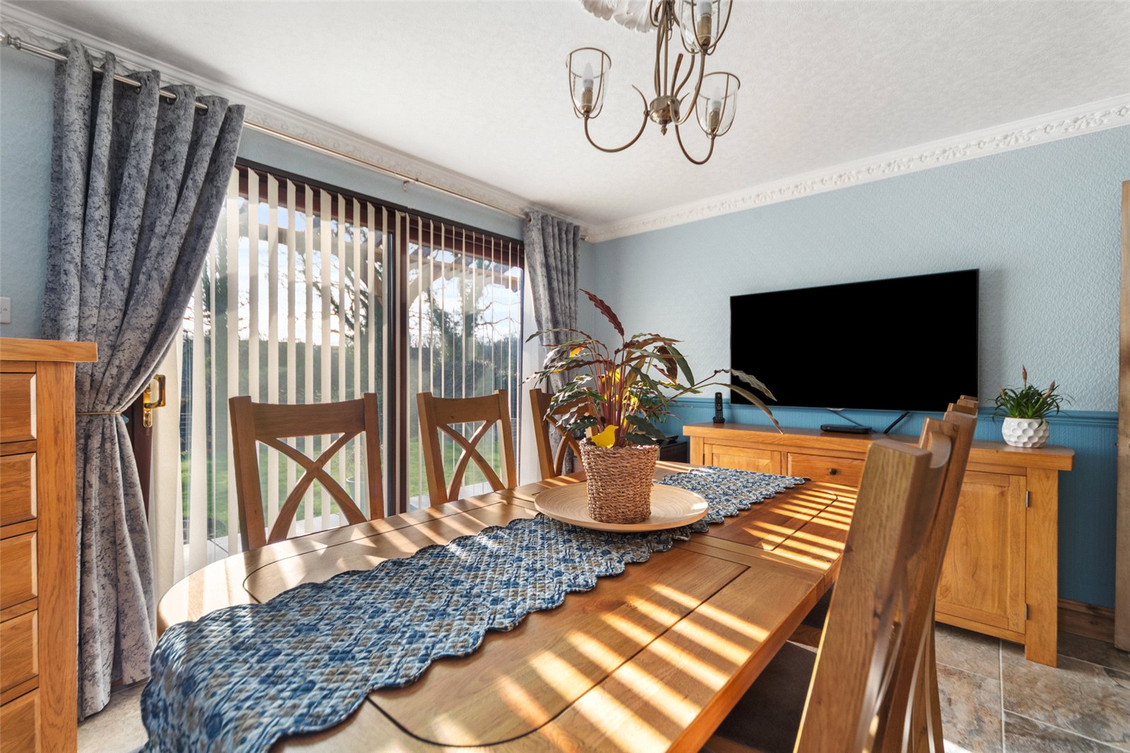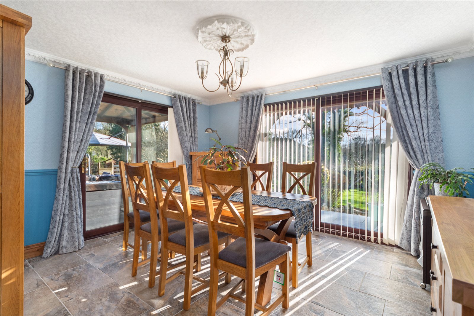 Adjacent to the lounge, the dining room boasts captivating features, including decorative cornice, uPVC double glazed sliding patio doors leading to the garden and hot tub, and stone-effect ceramic tile flooring. An anthracite radiator and a feature pendant light with a dimmer switch complete this elegant space.