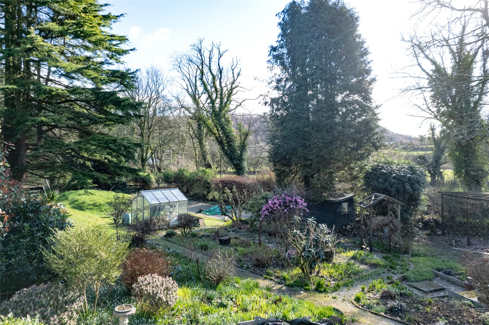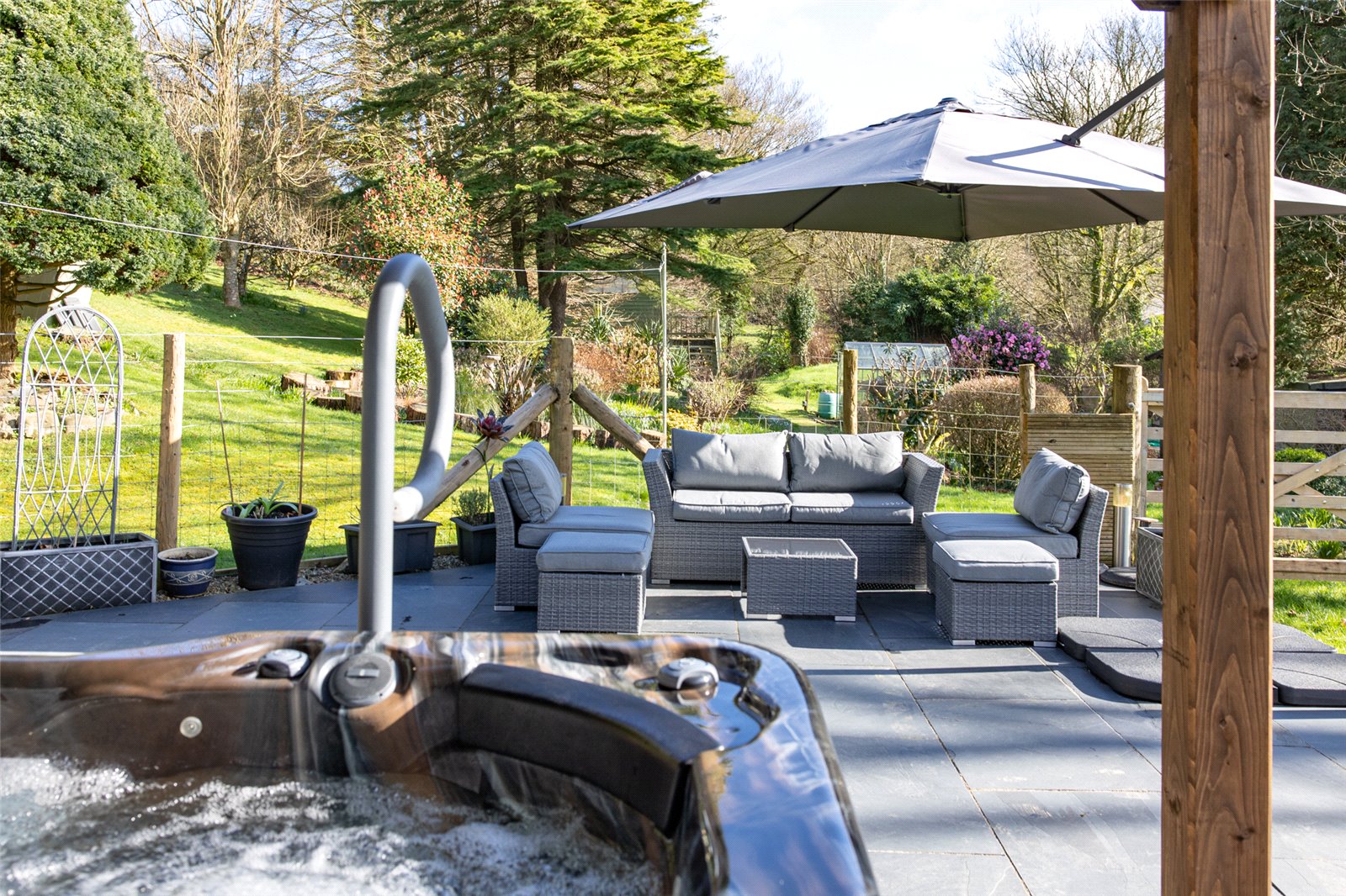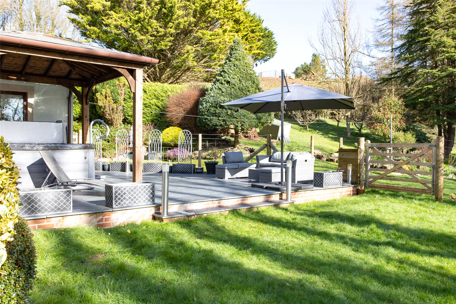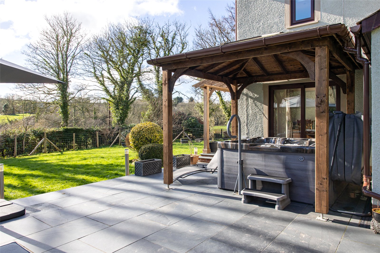 A gated entrance opens to a brick-paved driveway, providing ample parking as well as access to the garage. The grounds are a testament to meticulous landscaping, featuring mature trees, shrubs, and an established pond. A fully enclosed fenced garden area with a South-facing slate patio, wooden gazebo housing a hot tub, and a pergola overlooking the lawned garden create a private retreat perfect for personal relaxation and social gatherings. Beyond, the garden is a labyrinth through the acre it occupies. Functionality is key, with an outdoor kitchenette with functional ceramic sink and hot and cold water supply useful for gardening and outdoor food preparation. In addition, the property benefits from a raise plinth workshop, a greenhouse, a wood store, and a sizeable concrete base with the potential to build an outdoor workshop, outbuilding or home office, depending on the new vendors’ requirements and subject to planning if required. A gentle stream runs partially through the grounds, with a well-placed bridge allowing for access into a further garden area.
