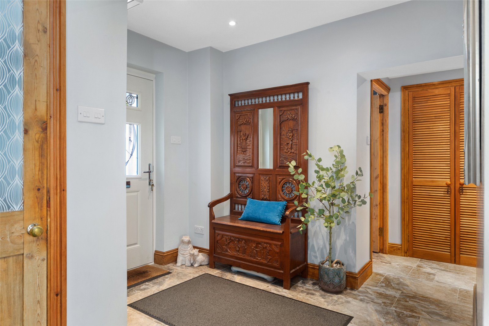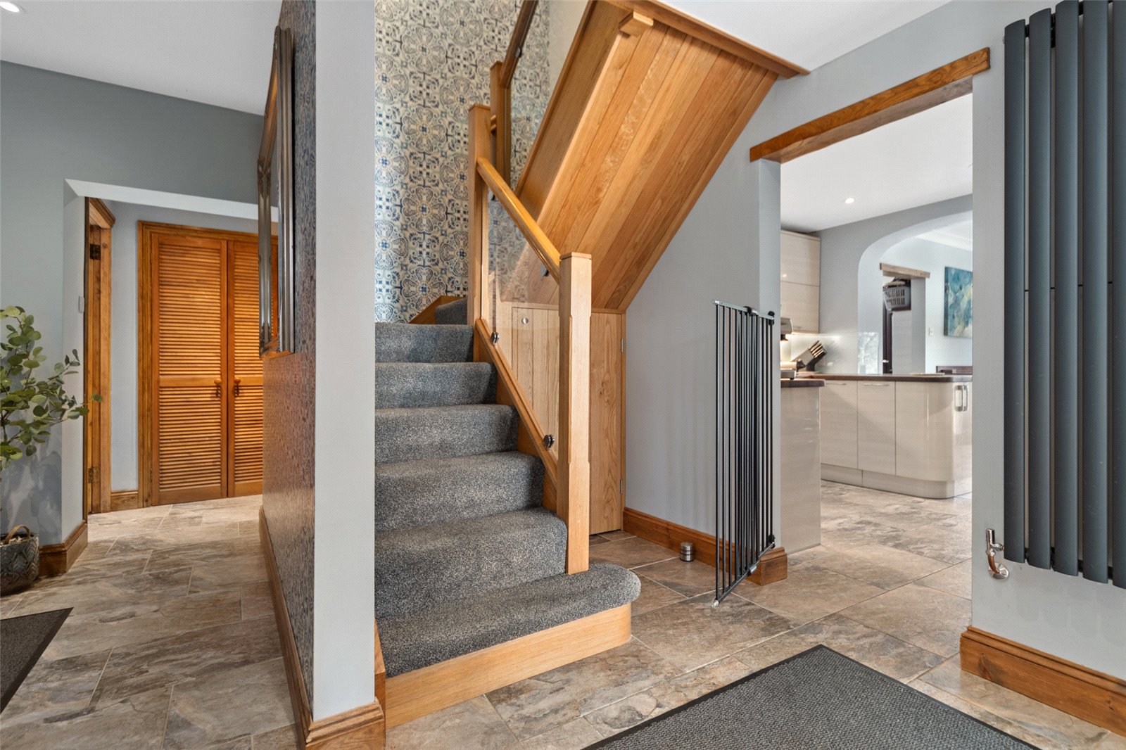 The entrance hall is a symphony of design, featuring a striking feature wall, stone-effect ceramic tile flooring, and a modern vertical anthracite radiator. Access to the first floor via bespoke oak stairs, with glass panel balustrades. The entrance hallway also benefits from ample storage spaces, from a conveniently placed storage cupboard to bespoke storage drawers and cupboards under the stairs. Access given to;