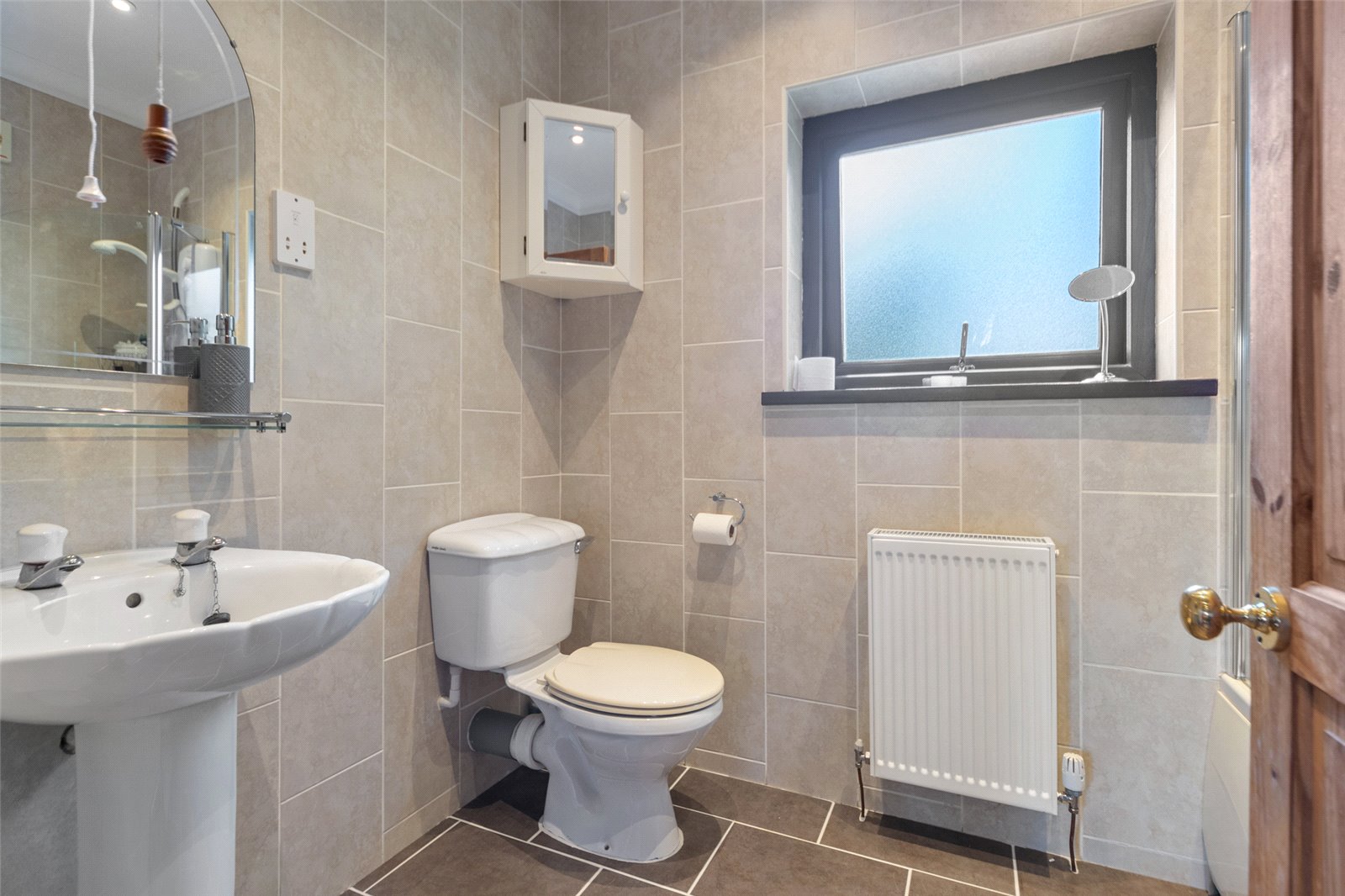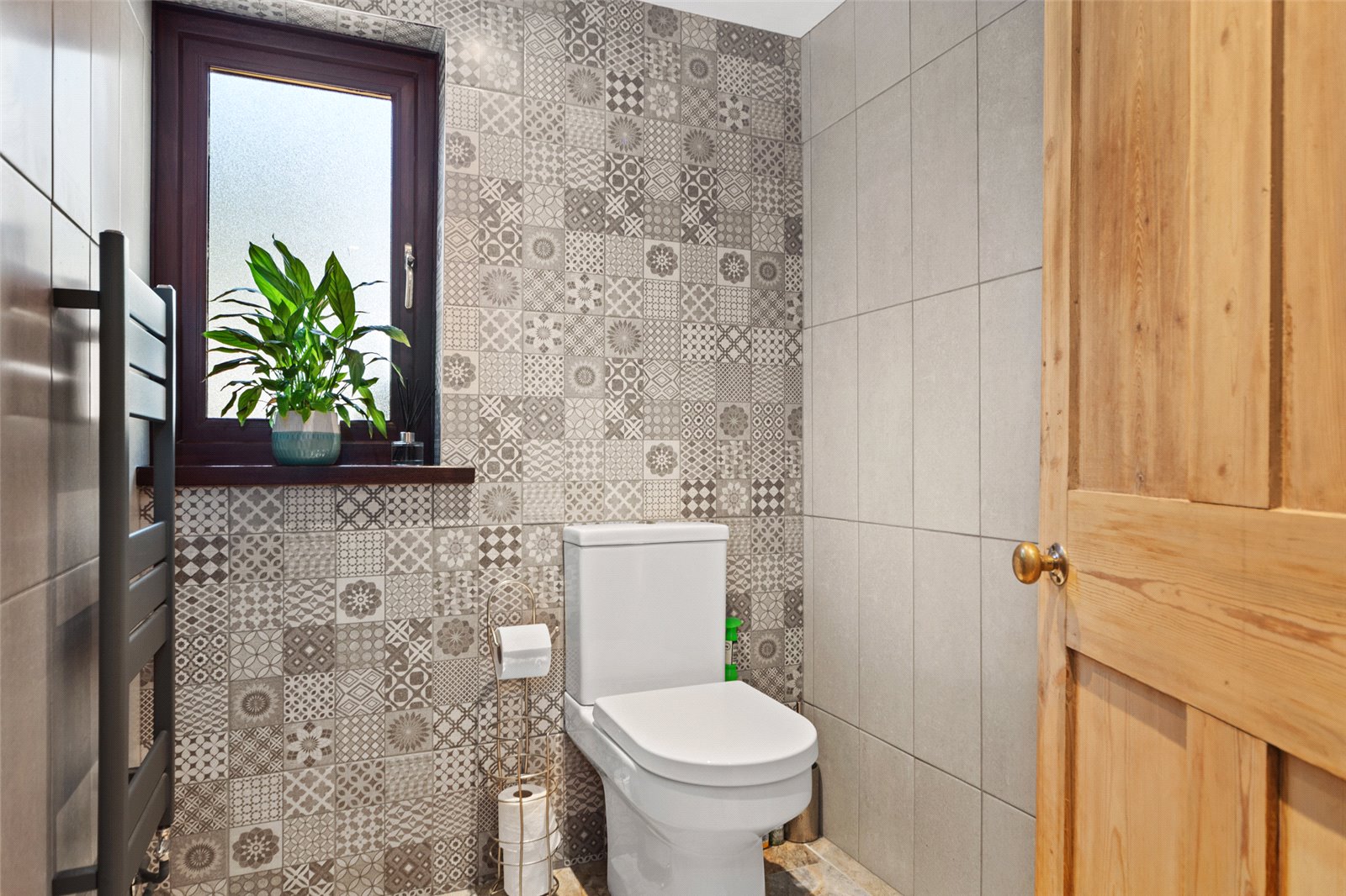 Step into the cloakroom through a solid natural wood door, where thoughtful design meets functionality. Close-coupled w/c and wash hand basin within vanity unit. Adorned with decorative ceramic tile walls, stone-effect ceramic tile flooring and an anthracite towel radiator.