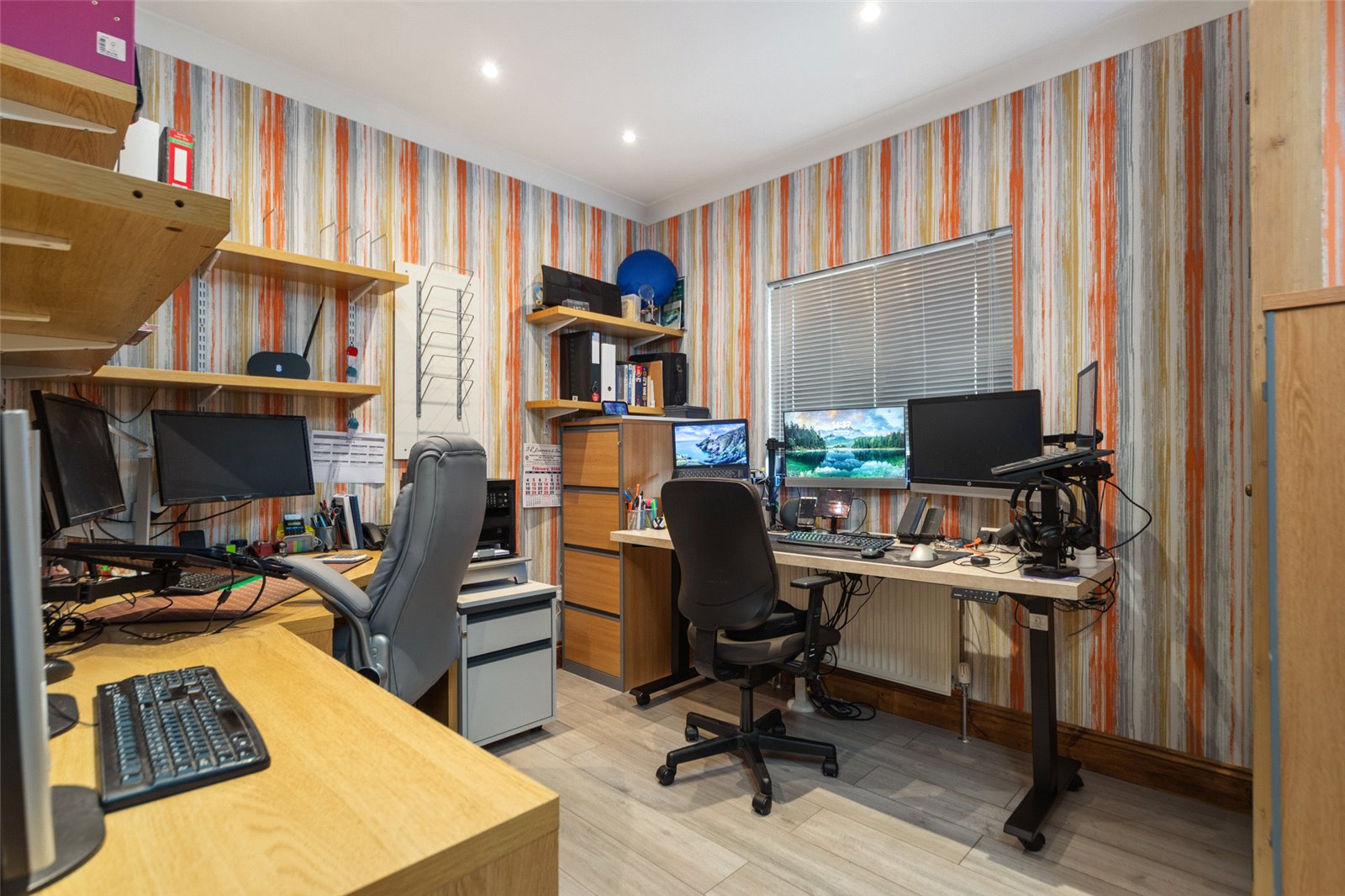 This versatile space currently serves as a home office, showcasing the adaptability of this thoughtfully designed room. The room is designed for functionality and organisation, featuring a fitted storage unit with shelving, complemented by wall-mounted shelves. An integrated telephone socket with a wired network hub caters to modern communication needs. Laminate flooring underfoot and a uPVC double-glazed window complete the space.