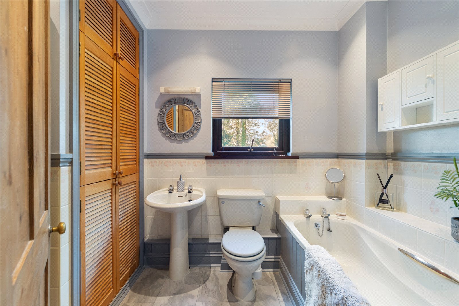 The suite is complete with a bath featuring wooden panelling, a w/c, a hand wash basin, and uPVC double-glazed windows that infuse the space with natural light. Additional elements include tiled walls, a shower unit, and practical features like an airing cupboard with shelving and wall-mounted vanity units.