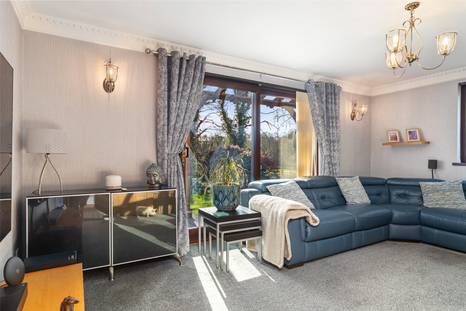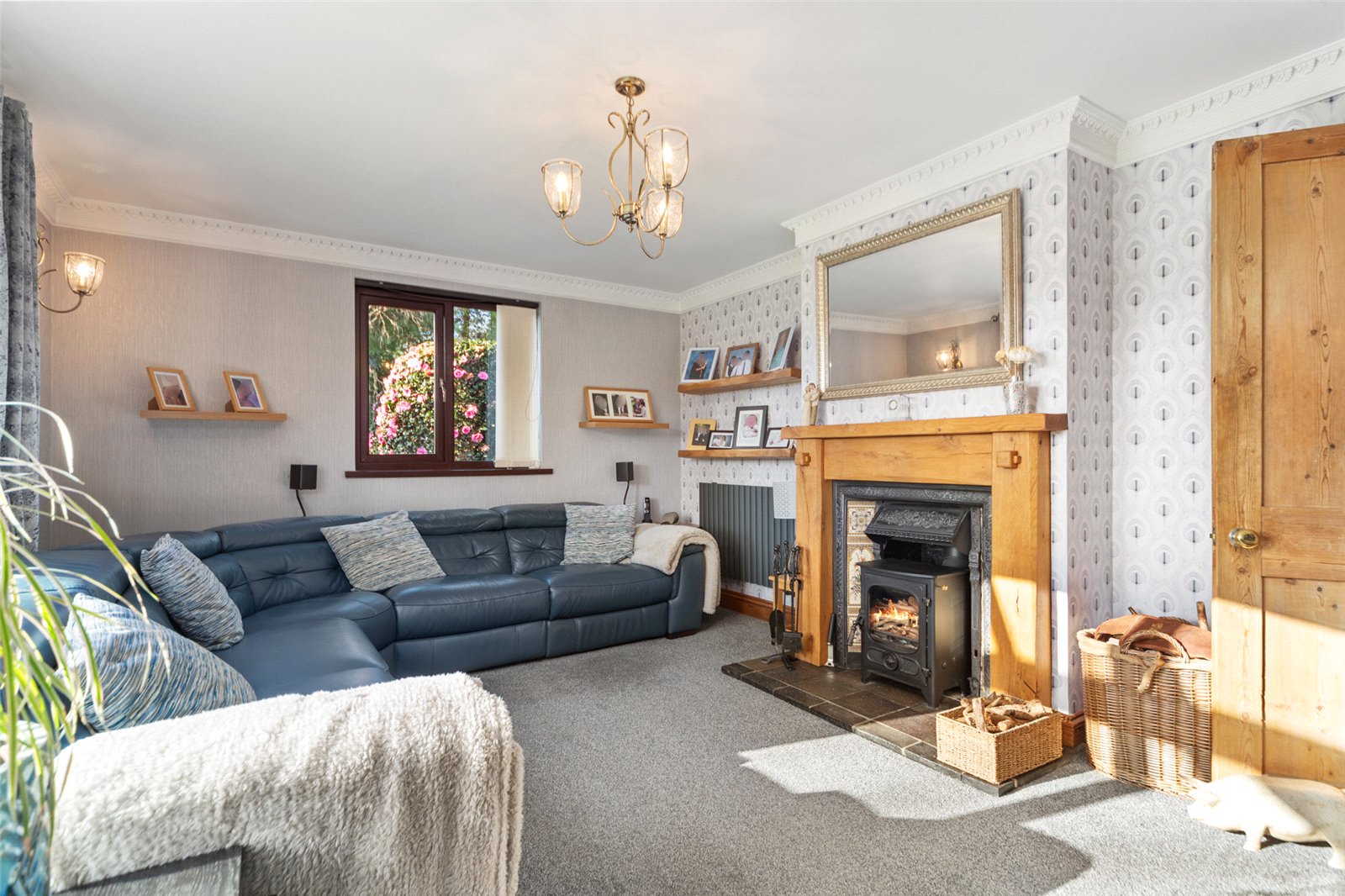 The heart of the home, the lounge, invites with a wood burner, slate hearth, and oak mantelpiece, creating a warm ambiance. Large uPVC sliding patio doors connect seamlessly to the garden area, while anthracite radiators, oak floating shelves, plush carpet flooring and decorative cornice add to the charm.